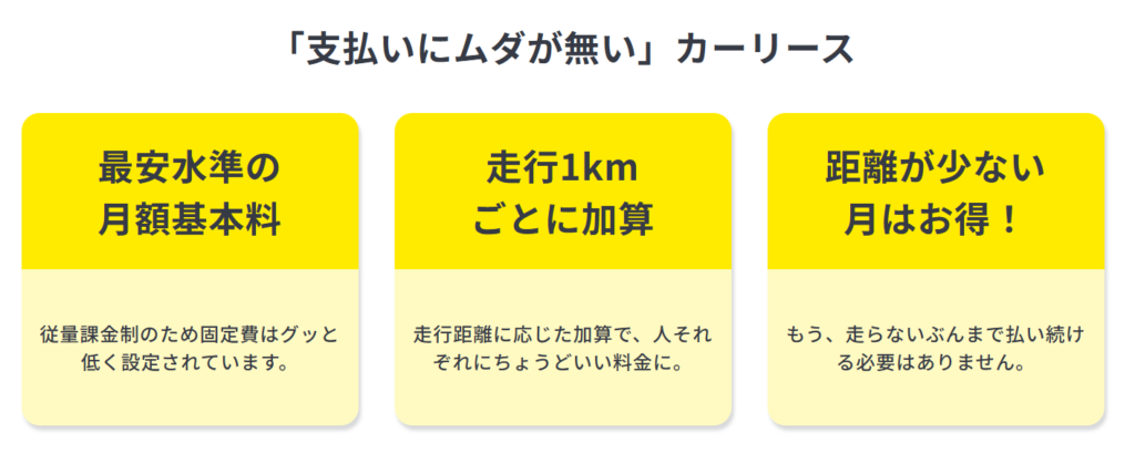 「車を所有するではなく、車を利用するという考え方に基づいた仕組みなんだよね。車両代・保険・税金・車検・メンテナンス費などが月額料金に含まれてるんだよね。」